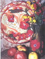 Иногда фрагменты стыковались со сбоем рисунка. Тогда на место шва наклеивался отдельный цветок. Ткань сама по себе очень выигрышна и самодостаточна по росписи, поэтому здесь не потребовалось дополнительной отделки. Тарелка сделана из проволочного каркаса, обтянутого холстом. Основной тканью стала синтетика охристо-розового оттенка с цветами в мягких пастельных тонах. Поверх нее наклеен рисунок, составленный из фрагментов фланели с яркими цветами. Чтобы утолщить ободок тарелки, на него была нашита толстая канатная веревка. Красный шелковый шпур, нашитый узором по ободку и краю тарелки, придает ей яркость и законченность.
