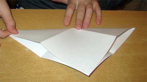 4. Нижнюю боковую сторону (образующую угол, состоящий из нескольких слоёв) согнуть к центру, захватывая один слой бумаги, разогнуть. Повторить действие сзади.
