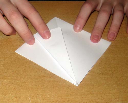 3. Сложить квадрат по диагонали один раз. Теперь на листе бумаги прорисовались линии, по которым нужно сделать форму «двойной квадрат». (Согнуть квадрат по диагонали, а два боковых угла вогнуть внутрь до середины).
