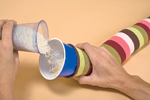 1. Возьмите один полосатый женский носок и заполните его рисом. Чтобы было легче - можно использовать пластмассовый стаканчик.
